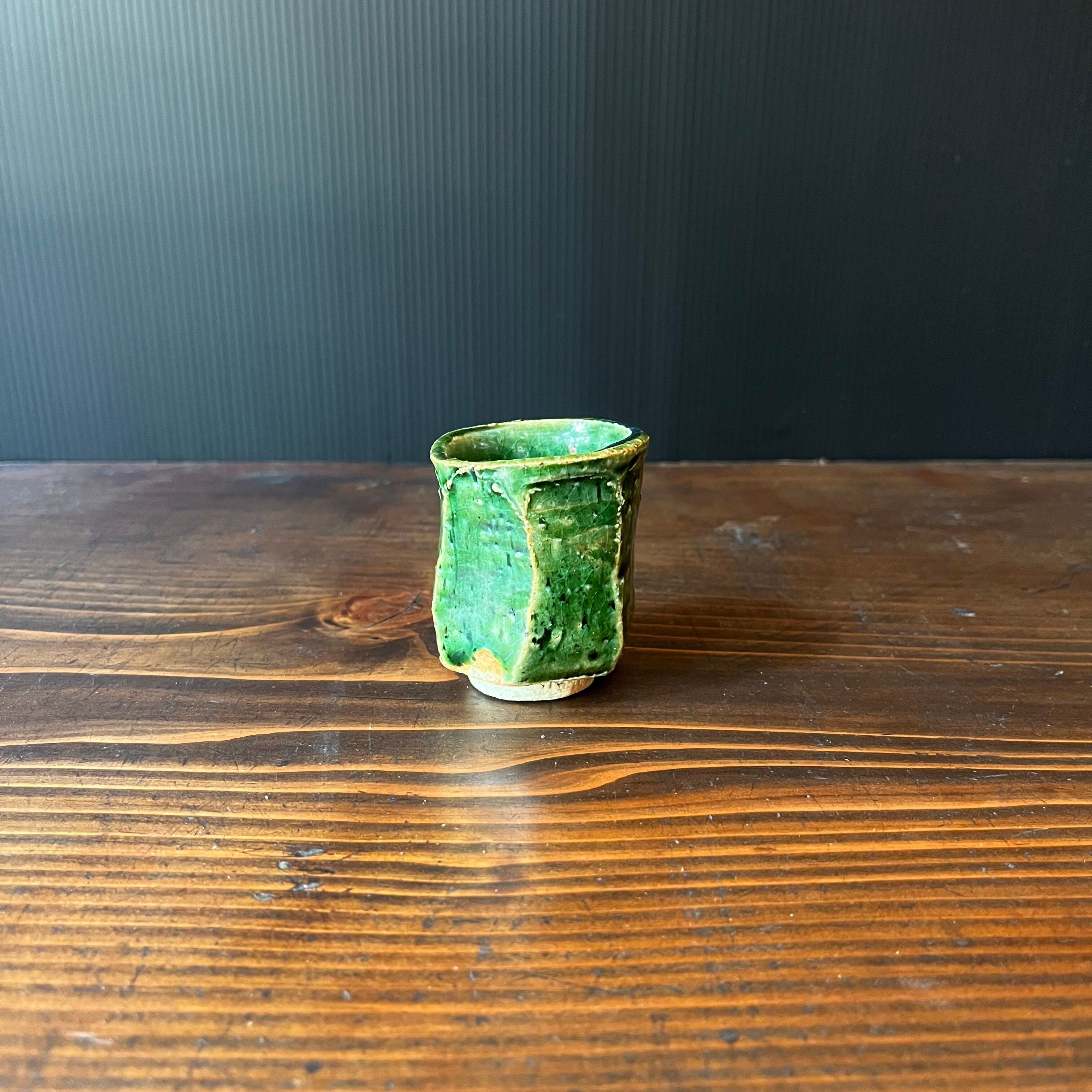 青織部のぐい呑みです。不規則な面取りのデザインが美しい。